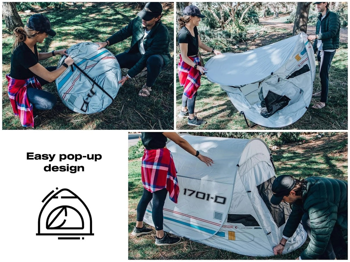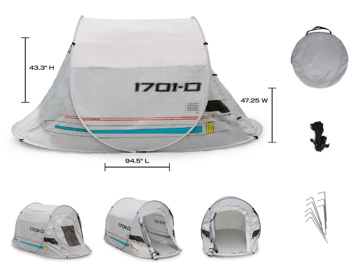Built to comfortably sleep 2-3 people, this tent is easy to set up for all of your outdoor adventures. The convenient pop-up design means no assembly is required, so Trekkies can enjoy a hassle-free experience. The camping tent features a portable design and comes complete with a carrying bag for storage. Easily pack it up for your intergalactic missions across the cosmos.
