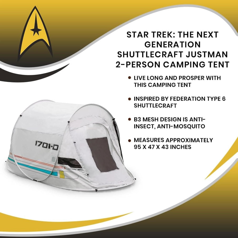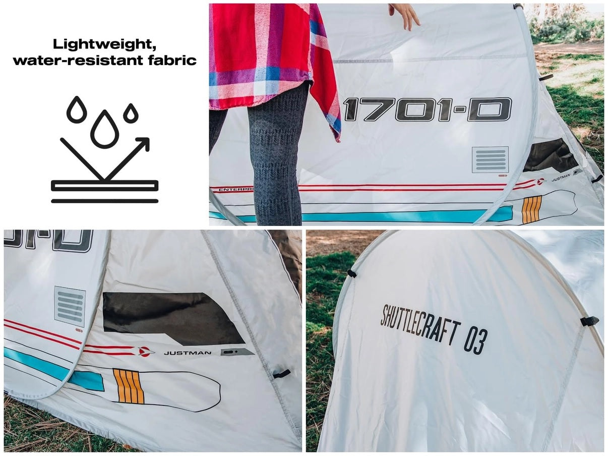 Do you ever look up at the stars and wonder... where is the U.S.S. Enterprise? We sure have! Stargaze all night long with this pop-up camping tent inspired by Star Trek: The Next Generation. The authentic design resembles a small-scale Federation Type 6 shuttlecraft, as seen attached to the Enterprise-D.